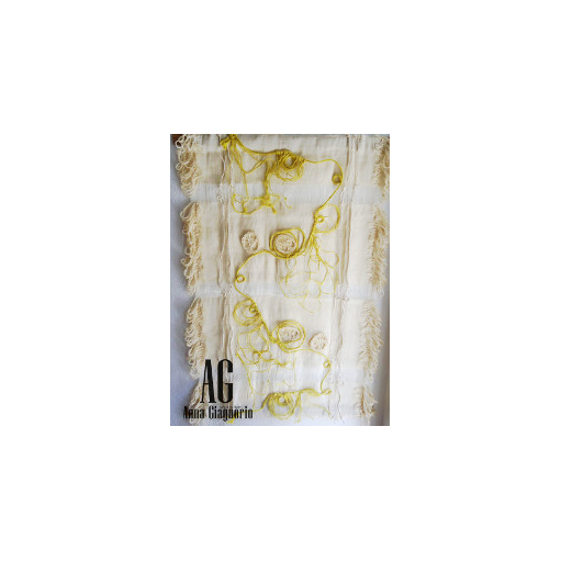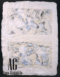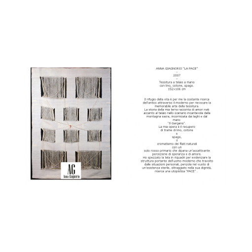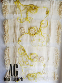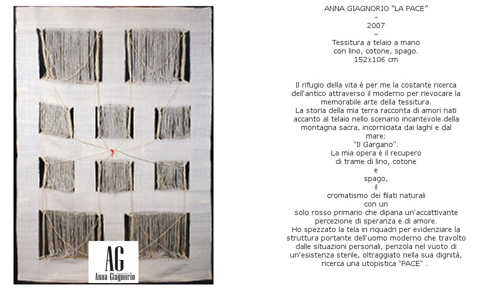 Gli occhi scrutano con attenzione capillare tutto ciò che il MODERNO butta,calpesta senza alcun rispetto. Me ne riapproprio creando TRAME di sentimenti antichi. La scultura è per me la costante ricerca dell'antico attraverso il moderno per rievocare le antiche arti come la tessitura. La storia della mia terra racconta di amori nati accanto al telaio nello scenario incantevole della montagna sacra, incorniciata dai laghi e dal mare: Il Gargano". Copyright © Anna Giagnorio-